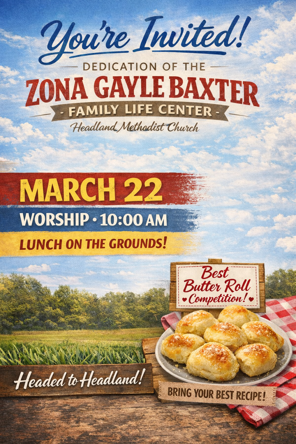 Join us on March 22 at 10:00am as we gather for worship and the Dedication of the Zona Gayle Baxter Family Life Center at Headland Methodist Church.